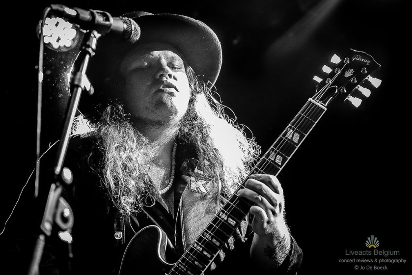Vanaf de openingssongs ‘Virginia’ en ‘Mourning Light’ wist Marcus King zich een weg te banen naar hart en ziel van elkeen in het publiek. Enerzijds met het fantastische gitaarwerk dat hij uit zijn Gibson weet te toveren, dan weer met die soulvolle doorleefde stem. Waar de muziek van Marcus King Band dikwijls gecatalogeerd wordt als bluesrock, kan ik je garanderen dat dit de lading absoluut niet dekt. In de daaropvolgende medley ‘Sharry Barry’, waarin ook een stukje ’25 to 6 or 4′ van Chicago en Funkadelic’s ‘I’ll Stay’ verweven zit, laat de band duidelijk horen dat ze uitstapjes richting soul, funk en jazz invloeden absoluut niet schuwen. Voor de bluesfans was het evenwel smullen van ‘Slow Blues’, waarin Marcus King bewijst dat hij de ziel van de oude bluesgitaristen in zijn vingers heeft zitten. In het meer funky ‘Good Man’ mogen de blazers dan weer het voortouw nemen, een rol die ze meermaals op zich nemen tijdens het concert. En met grote klasse. Want niet alleen Marcus King geeft vanavond blijk van een grote maturiteit en speltechnisch vermogen, ook zijn jonge enthousiaste band is van een zeldzaam hoog kwalitatief kaliber. In hun respectievelijke soli mochten ze dat uitgebreid etaleren, maar het verdwijnt in het niets in vergelijking met het continue weerwerk en variatie die ze bijdragen aan de prachtige songs.