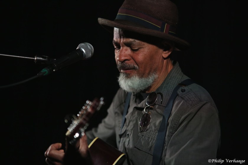 Na deze geweldige set van Cajun two-steps, low-down blues, funky New Orleans grooves, boogiewoogie piano en enkele hartbrekende ballades trokken we een laatste keer de zaal in voor de Grammy Award winnende Guy Davis. Zijn muzikaliteit ligt op de crossroads tussen blues en country folk. Originele nummers en geweldige interpretaties van traditionele songs, dat is zijn trademark. Hij werd geboren in New York City, maar is muzikaal beïnvloed door zijn grootouders die in het zuiden woonden. Davis vertolkte de rol van Robert Johnson in het theaterstuk ‘Robert Johnson: Trick The Devil’. Een opgewekte en vaak rapsodische zoektocht naar de ziel van de muzikant. Net zoals bij Guy Davis. Vorig jaar verscheen zijn 15de album ‘Be Ready When I Call You’. Davis speelt gitaar, boeit met zijn warm en zuiders stemtimbre en kreeg backing van mondharmonicavirtuoos Paul De Laat. We trokken opnieuw de Delta in en werden gemagnetiseerd door songs als ‘Watch Over Me’, ‘The Maggie Campbell Blues’ en ‘Just Like A Woman’, waar de tristesse zo van afdroop. Guy Davis is onvoorwaardelijk een ambassadeur voor de akoestische Delta bluesmuziek.