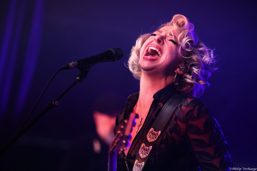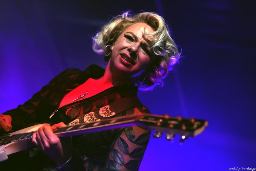 De blonde bluesgodin Samantha Fish maakte haar opwachting in de Club Mississippi. Eigenlijk hadden we Samantha, gezien haar status, ook wel al eerder verwacht in Peer. De stage rond de Club Mississippi zat dan ook afgeladen vol. Dik elf jaar geleden had ik de gelegenheid om interviewgewijs rond de tafel te zitten met dit sexy wonderkind uit Kansas City, MS. voor Back To The Roots, Bluesmagazine. Samantha had toen net de Ruf’s Bluescaravan achter zich gelaten en promootte volop het succesvolle album ‘Runaway’. Sinds haar 13de ramde ze op een drumtoestel, om twee jaar later over te schakelen op gitaar. Samantha speelt en zingt vol passie en hartstocht.